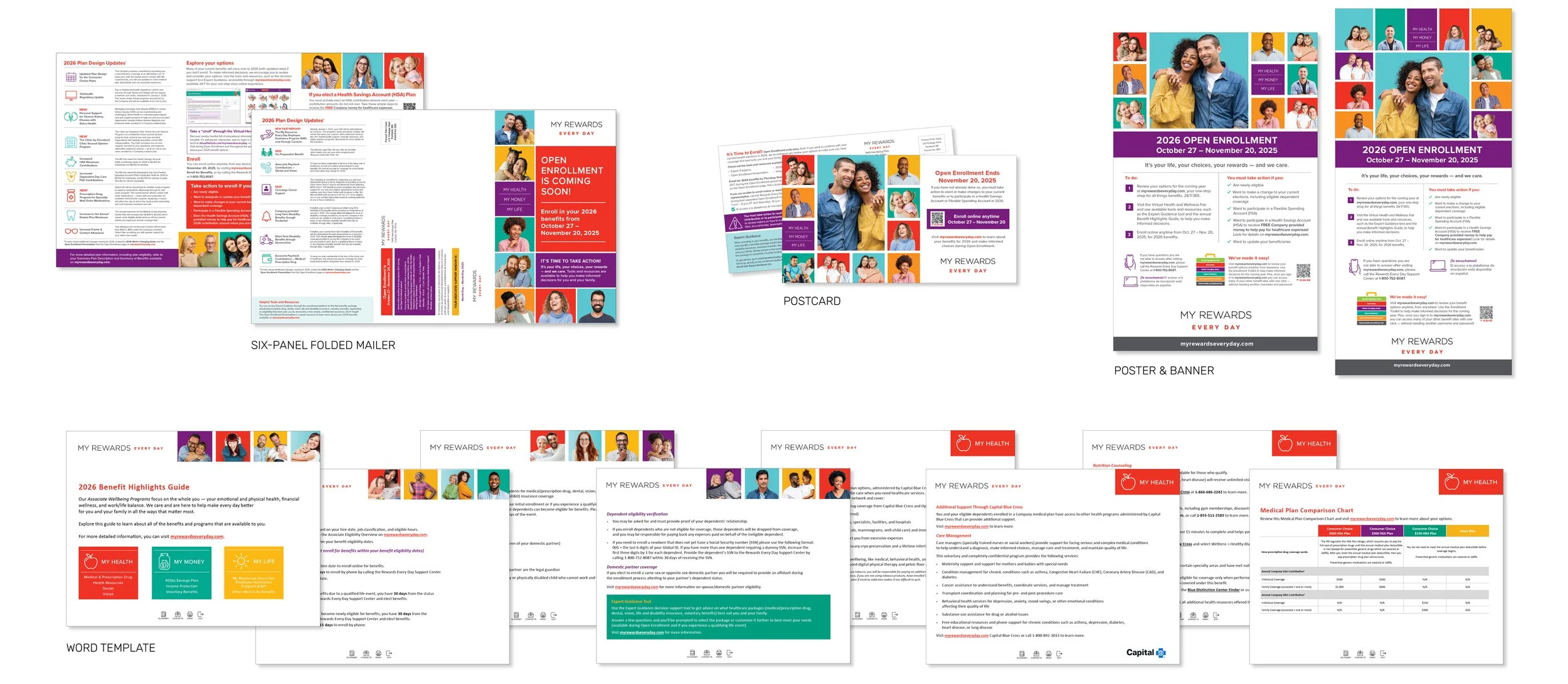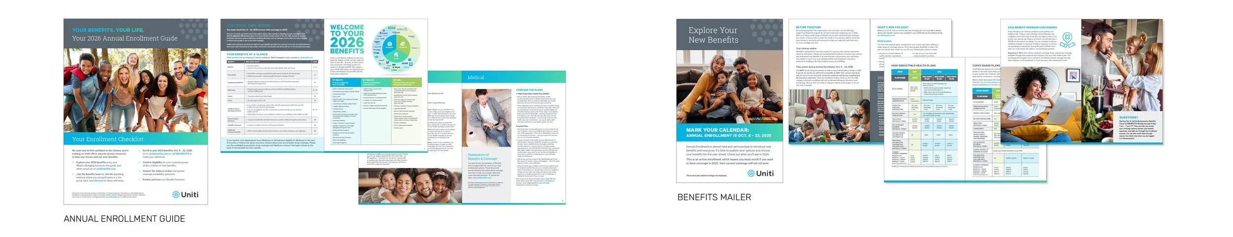 This project involved creating an annual enrollment information guide for Uniti. I was provided the new logo and brand standards, and starting from the previous year’s layout, I updated the overall look of the materials to align with the updated Uniti brand. I created two versions of the Annual Enrollment Guide, and brochure mailer, and several digital versions to be distributed throughout the company. I selected all stock photography and took care to select images that portrayed a wide variety of people in various stages of life while highlighting the information being delivered. For these information dense projects, I think good design involves organizing information in such a way that the content can be digested easily to make it easier for employees to quickly find all the information needed to make an informed decision about the right benefits package would be best for the employee and their families.