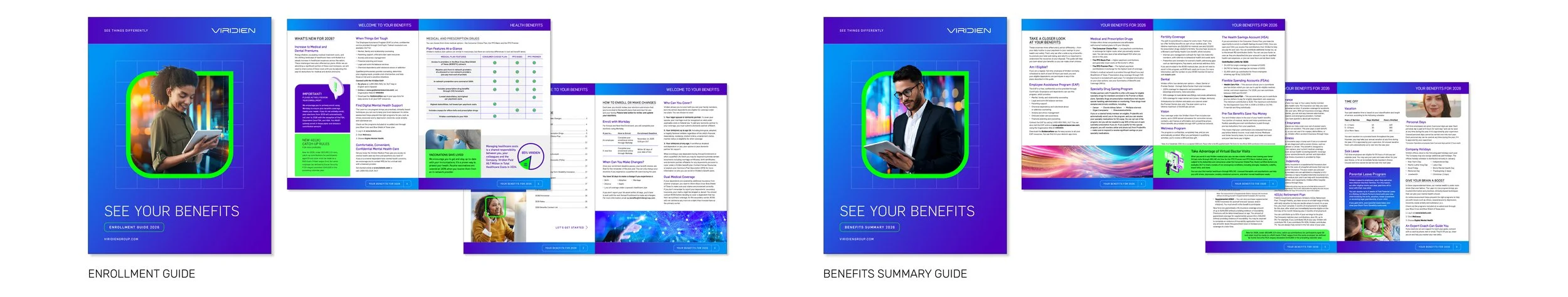 Viridien healthcare benefits brochure distributed digitally for all employees. I was provided updated brand standards for the new logo and applied these design updates to align with the new company brand while maintaining information hierarchy to improve employee understanding of the cost and benefits for 2026.